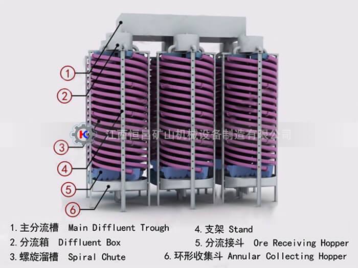 BLL型螺旋溜槽設備由給礦勻分器、給礦槽、螺旋葉片、產(chǎn)品截取槽、接料斗和槽支架六個部分組成。螺旋葉片是由玻璃鋼(玻璃纖維增強塑料)制成,借螺栓聯(lián)接在一起。