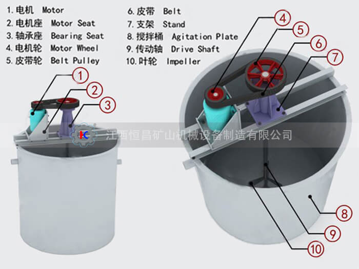 單葉輪順時(shí)針(從上向下看)轉(zhuǎn)動時(shí)沉浸在礦漿中的葉片,對礦漿產(chǎn)生推和擠的作用,使礦漿從循環(huán)筒上部流入葉片,經(jīng)導(dǎo)向葉片沿循環(huán)筒向上流動,當(dāng)?shù)V漿通過循環(huán)筒后,便成槽向活動,再沿循環(huán)筒外壁向上流動,而后再返回循環(huán)筒上部,構(gòu)成閉路循環(huán),由于新礦漿繼續(xù)給入槽體內(nèi),將通過藥劑和空氣充分混合的合格礦漿便不斷的從排礦口(溢流口)排出,完成了本槽的浸出作業(yè)。