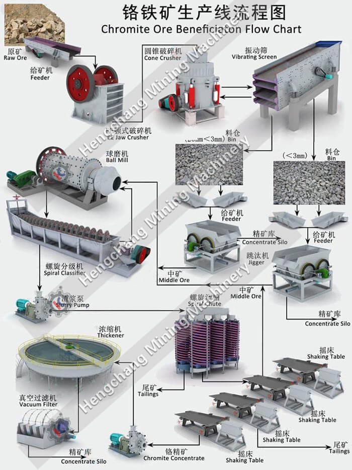 對(duì)于鉻礦選礦,有重選、浮選、磁選等多種方法,江西恒昌礦機(jī)會(huì)根據(jù)礦石分析報(bào)告及選礦試驗(yàn)報(bào)告等給出最終的選礦方法。其中常用的重選主要選礦流程為:兩段破碎,一段磨礦,螺旋溜槽粗選,螺旋溜槽掃選、搖床精選工藝。