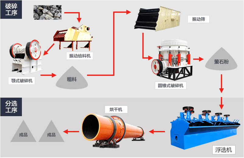 螢石礦的選礦工藝需根據(jù)礦石性質(zhì)以及客戶要求精礦品位等多方面的因素制定,一般要求冶金級(jí)螢石精礦的選礦只需經(jīng)過手選,重選即可,對(duì)于酸級(jí)化工行業(yè)用螢石精礦粉的制取需要采用浮選的方法獲得,該工藝通過手選,重選,浮選聯(lián)合工藝處理螢石礦,具有較強(qiáng)的代表性